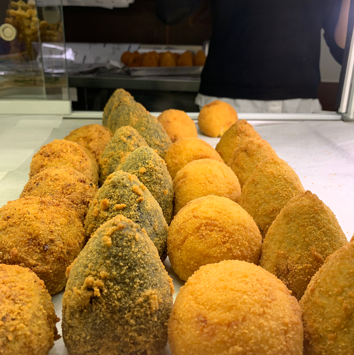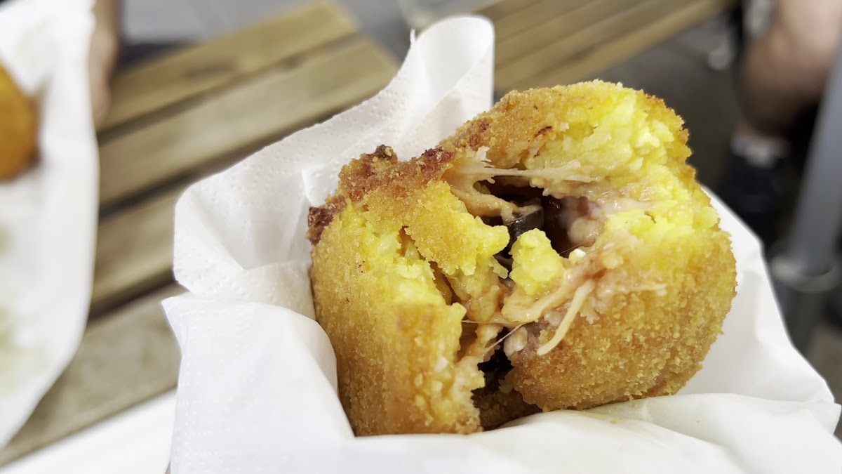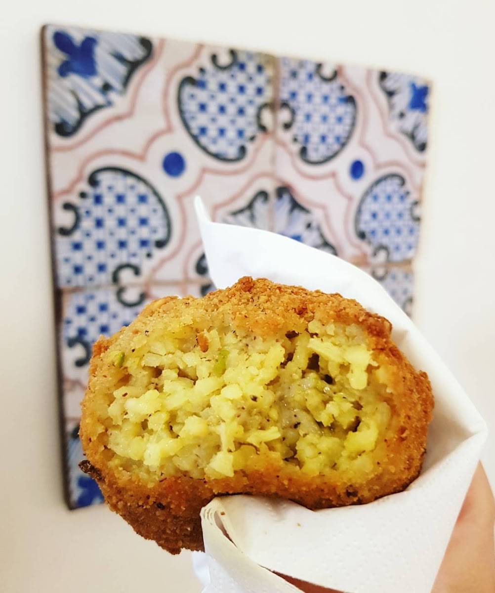 I wasn't hungry for a full meal so I decided to try the arancini as a quick snack before my scheduled tour. This shop was highly reviewed so I thought, perfect option. I ordered 1 spinach filled and a classic arancini which I was told was filled with eggplant. The spinach was by far my favorite and while they were still slightly warm, it would have been perfect had they come freshly made or toasted in the over for maximum crispiness. The second to my surprise, was filled with a type of fish, not eggplant. It was still tasty but not what I was expecting. Service was okay, but it was near the end of the day and their eagerness to welcome customers or address their questions felt lacking. Overall, I was happy that I stopped by and would recommend visiting this little shop.